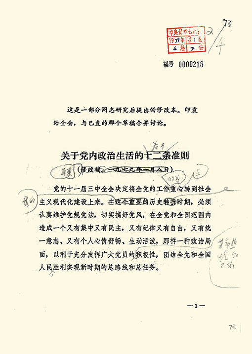 在中国国家博物馆举办的《伟大的变革——庆祝改革开放40周年大型展览》中,陈列着一份《关于党内政治生活的若干准则》(修改本)。这份修改本,连同陈云1979年2月28日就《准则》等问题的信,都是见证《关于党内政治生活的若干准则》这部新时期重要党规党法诞生过程的珍贵文献。