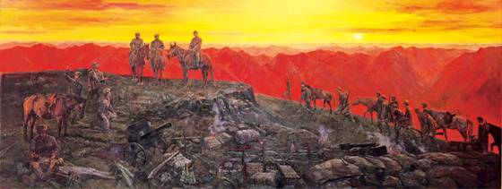 扎西整编后,中央红军以崭新的精神面貌取得了娄山关大捷。图为布面油画《娄山关大捷》 。 郑艺、宋克、周楷、关君 绘