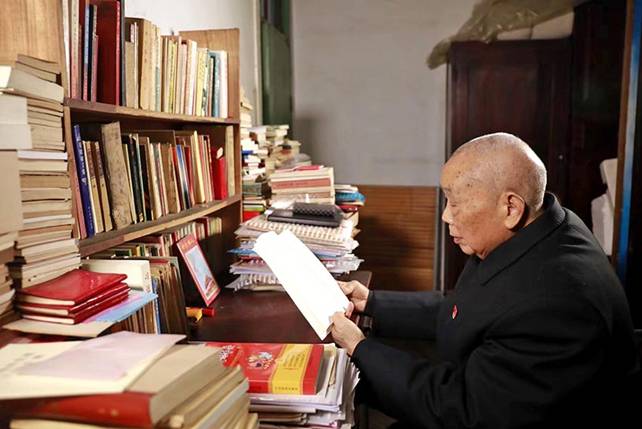 93岁的周永开还在坚持学习党的方针政策。
