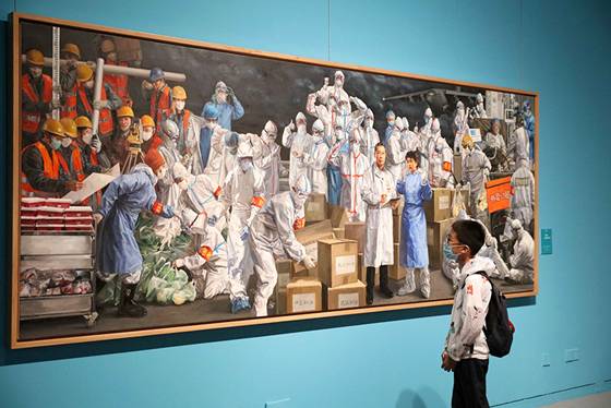 游客参观中国国家博物馆“众志成城——抗疫主题美术作品展” 。陈晓根/摄