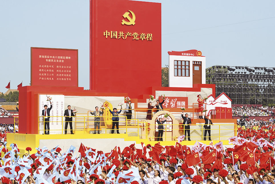 庆祝中华人民共和国成立70周年群众游行中,“从严治党”方阵彩车上的“中央八项规定精神”元素引人注目。