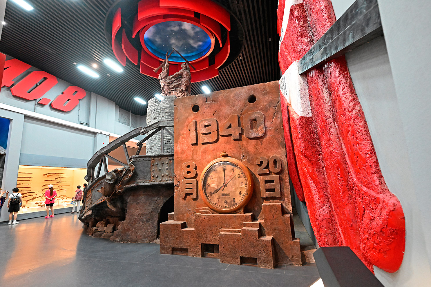 步入“百团出击 破袭交通”展示部分,观众首先被一组抢眼的造型设计所吸引。巨幅石刻台历上写着“1940年8月20日”,怀表上的时间定格在“星期二”“20时”,这是百团大战打响的时刻;右侧墙面上有三面红旗造型,代表着参战的晋察冀军区、第129师和第120师三支队伍。
