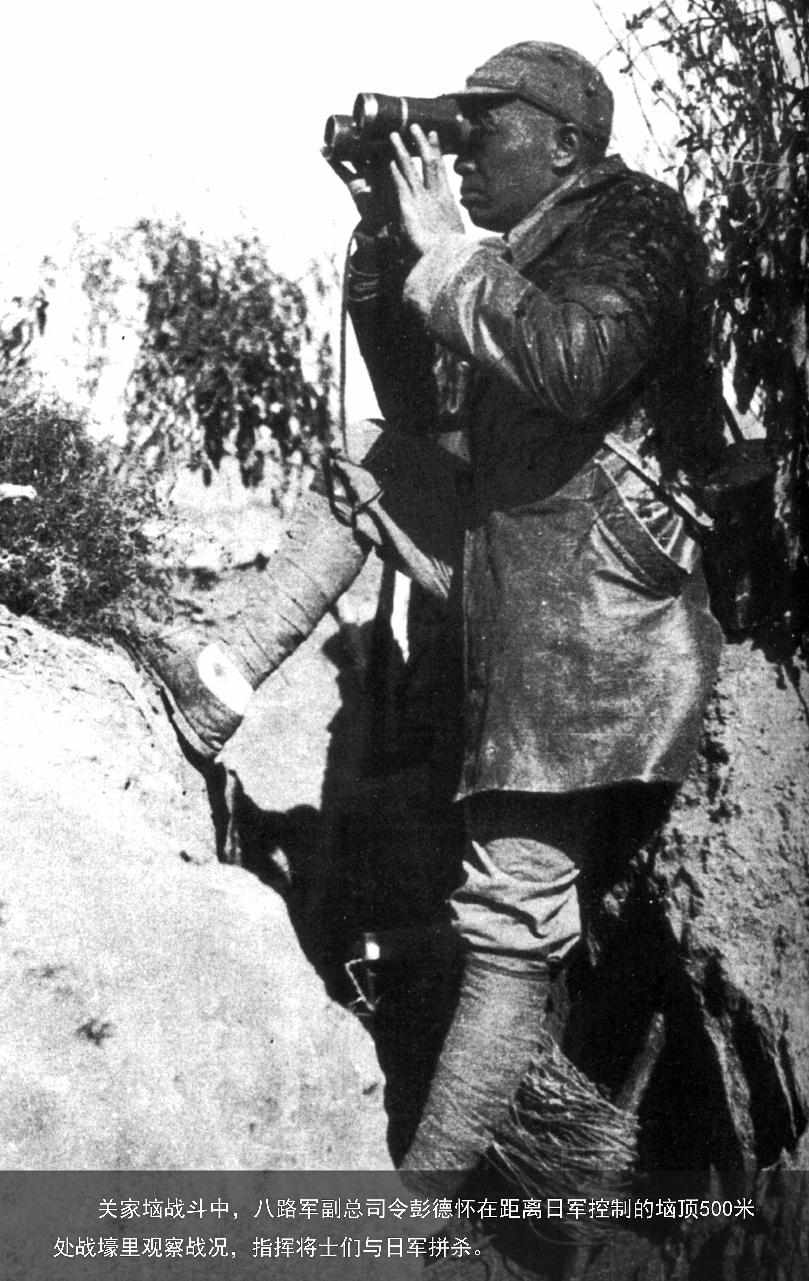 1940年10月,日军对华北抗日根据地进行残酷“扫荡”,各抗日根据地党政军民密切配合,展开机动灵活的反“扫荡”作战。在“晋冀豫抗日根据地反‘扫荡’”展示单元,一张八路军副总司令彭德怀在战壕里端着望远镜观察关家垴战况的老照片,十分引人注目。10月下旬,日军冈崎大队瞎打乱撞闯进了黄崖洞,这是一个岩壁上的天然石洞,里面建有八路军总部最大的兵工厂——黄崖洞兵工厂。日军袭扰兵工厂后,行进到三面临崖的蟠龙镇关家垴。得知消息后,彭德怀决心消灭这股日军。战斗开始后,彭德怀冲到前线,指挥八路军血战两个昼夜,日军伤亡大半仓皇而逃,八路军也付出了重大牺牲。当时彭德怀所在的战壕距离日军控制的垴顶只有500米,而日军武器的射击范围是七八百米,彭德怀大半个身体都露在壕外,一边用望远镜观察敌人的动态,一边指挥战斗,任凭日军子弹呼啸着从头顶飞过,他却镇定如常。战地摄影师徐肖冰拍下了这张珍贵的照片,记录了八路军将领大智大勇、不怕牺牲的伟岸形象。