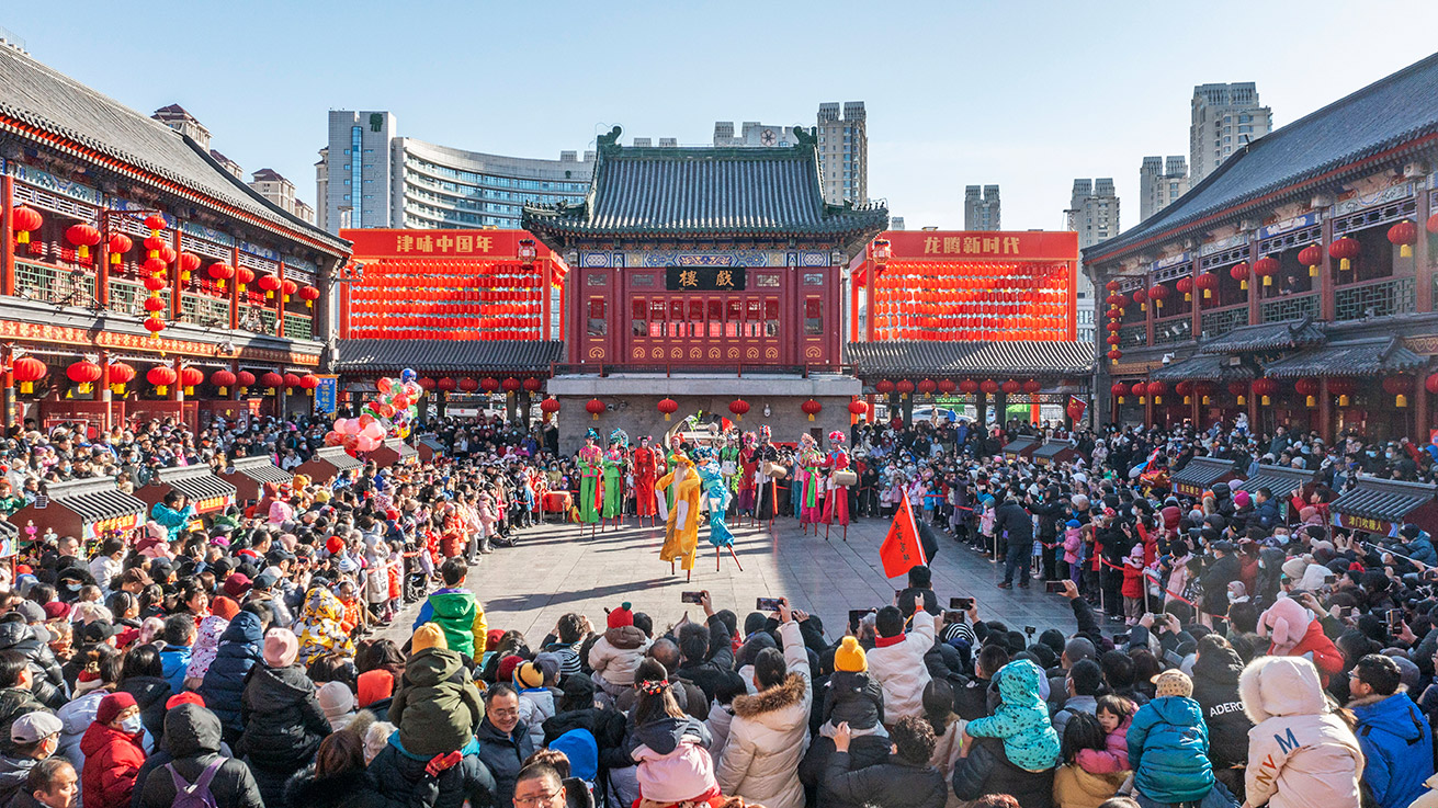 农历春节期间,南开区古文化街上演民俗表演,吸引市民游客。