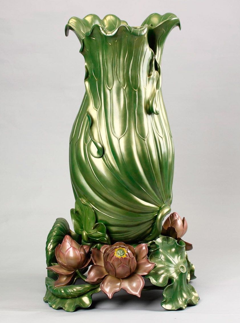 厦门市博物馆藏的彩绘莲子堆果,以酱釉复刻莲子饱满之态,暗合“种廉于心”的深意。莲子高低错落的排列,不仅是自然的写实,更暗喻着廉洁种子在不同土壤中萌发的生命力。当莲子冲破黑暗,便迎来生命的第一次舒展。制作于清末民初的沈正镐脱胎荷叶瓶将瞬间定格为永恒,叶缘卷曲如君子低眉,漆色青绿似初心未染,口沿处精妙的波浪造型,是匠人对“濯清涟而不妖”的诗意诠释。三件宋器组成的“成长组曲”同样引人驻足:青釉莲花四管插器如少年初立,青釉莲花灯火焰柱象征明烛高照,青白釉莲花三联盒上含苞、初绽、盛放的莲花,恰似清廉修为的三重境界。