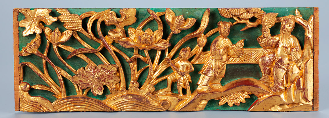 展厅内一组以《爱莲图》为主题的金漆木构雕件,以绿底金漆的配色吸引人们的目光。民间建筑的木构件中常见此物,表达主人对正直清廉的追求。展出的清代雕件为长方形门窗构件,以童子欲采莲象征对廉洁初心的倾慕,长者观莲体现“可远观而不可亵玩”的敬畏。战国时期的马具“铜节约”和明代“正其衣冠”铜镜,则用一“约”一“镜”,共同传递廉洁文化的双重要求:制度约束与道德自省。日常器物中的点滴教化,入眼入心。