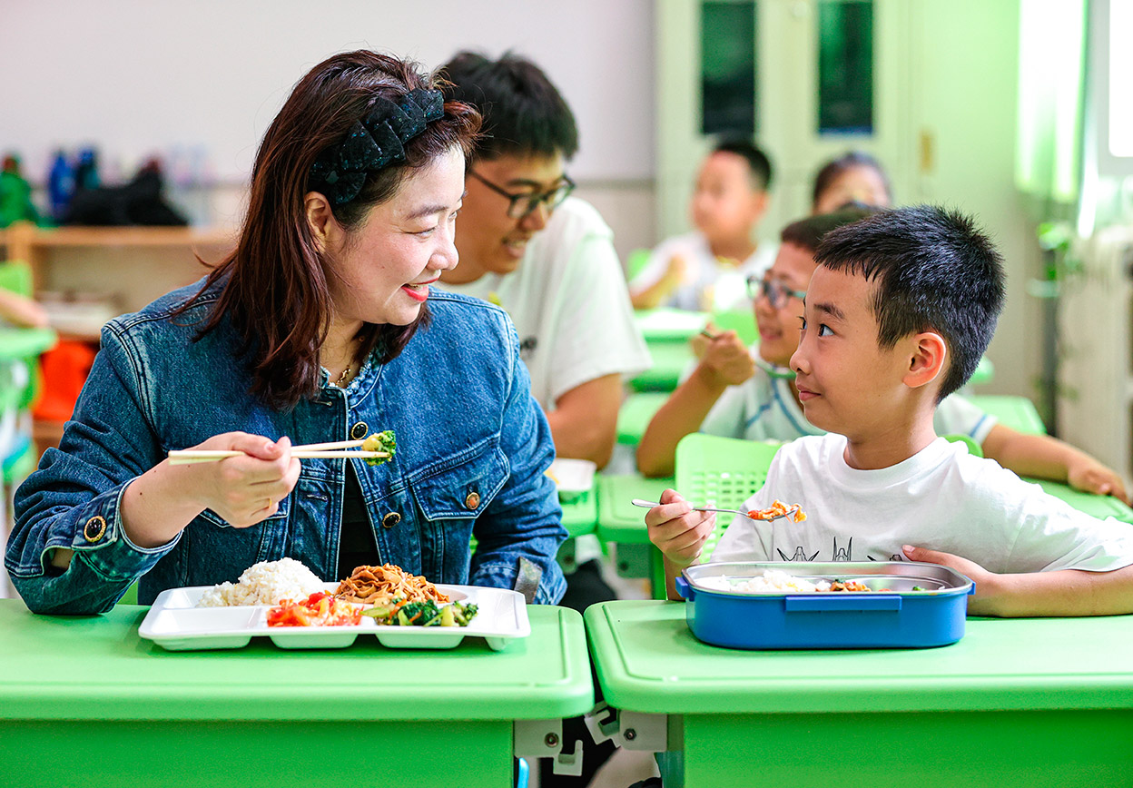 沈阳市和睦路小学教育集团一年级新生家长代表与孩子在班级共进午餐。