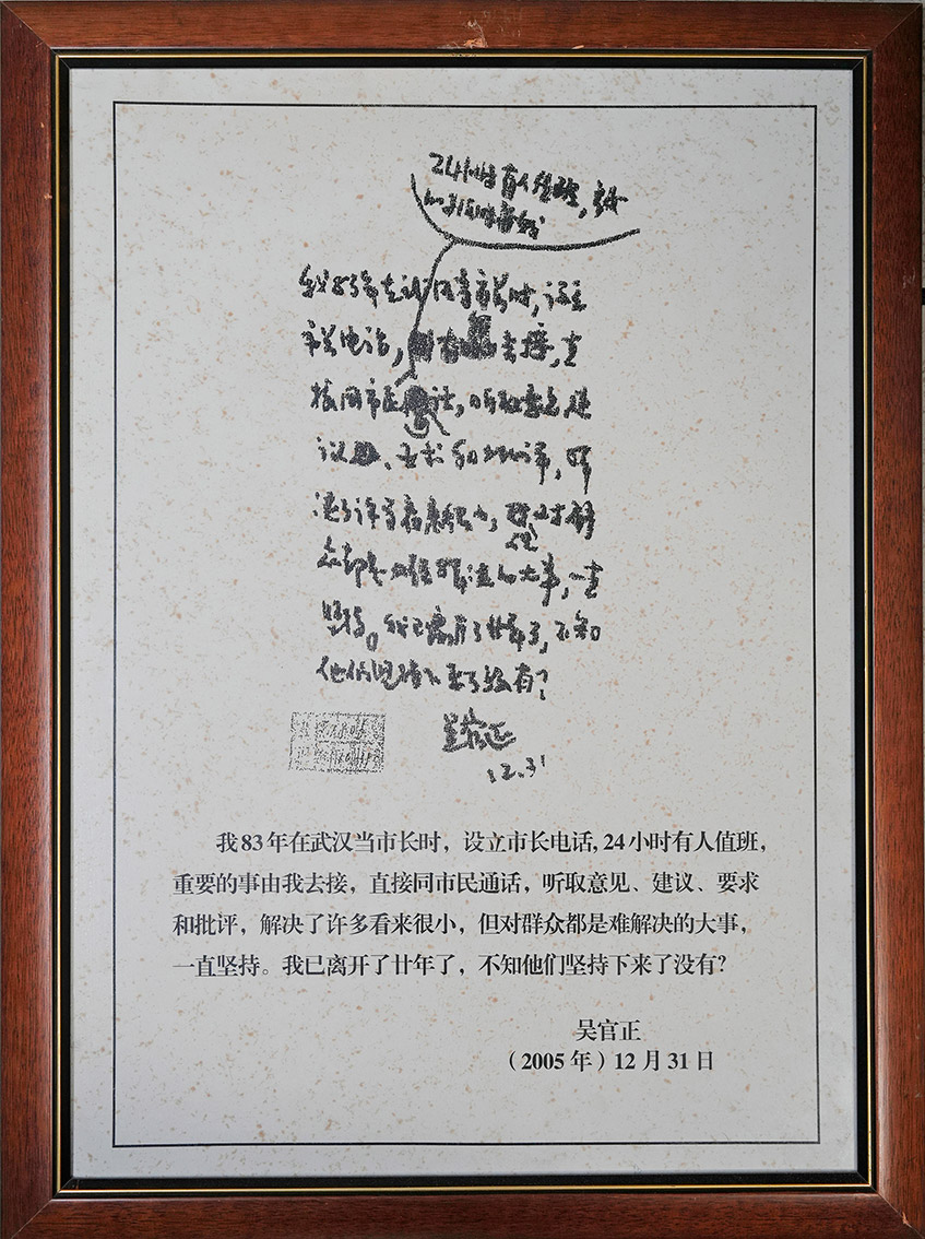 在武汉12345热线大楼里采访时,工作人员笑道:“我们热线和你们杂志还很有渊源呢。”循手望去,走廊里挂着两篇装裱的本刊文章,一篇写于2005年,吴官正同志在上面批示:“我83年在武汉当市长时,设立市长电话……解决了许多看来很小,但对群众都是难解决的大事,一直坚持。我已离开了廿年了,不知他们坚持下来了没有?”另一篇是2006年本刊记者前往武汉,写下《湖北省武汉市市长热线:为民服务纪实》一文,吴官正同志再次作出批示。