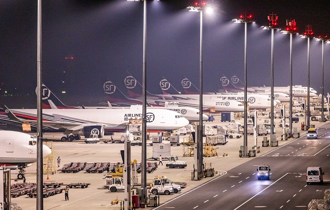 凌晨的鄂州花湖国际机场货运区灯火如昼,货运飞机整装待飞。薛婷/ 摄