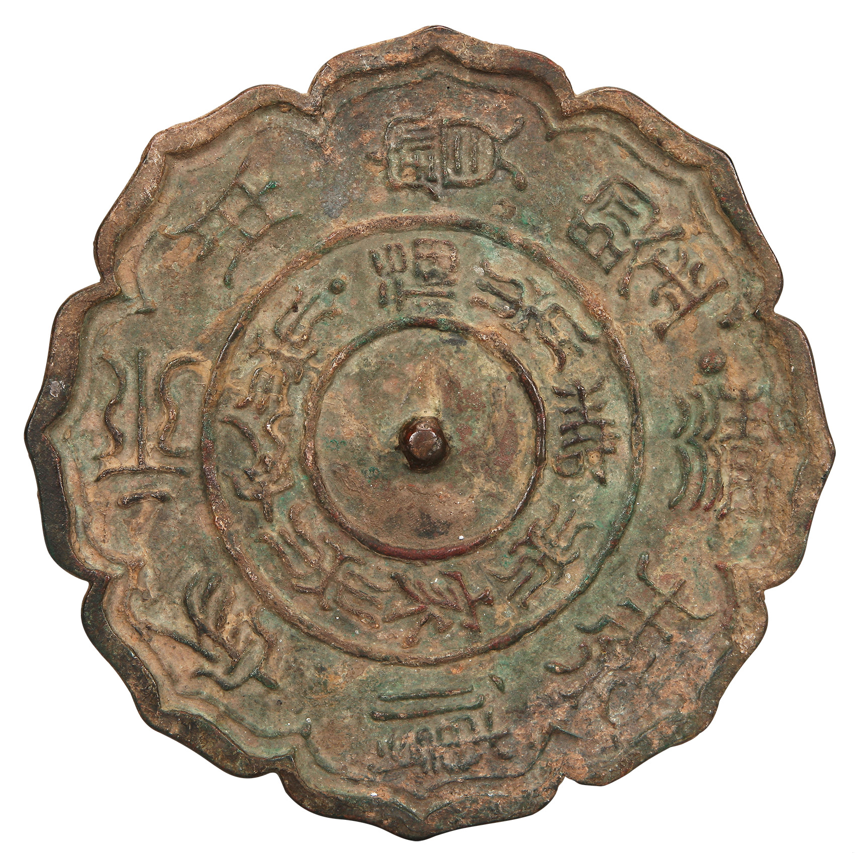 此铜镜为北宋时期青铜制八瓣菱花镜,内区环铸“福寿家安”四字,外区环铸“清素传家永用宝鉴”。“清素传家”是宋代及以后铜镜中较为流行和普遍的铭文,寓意着清廉朴素的道德追求。