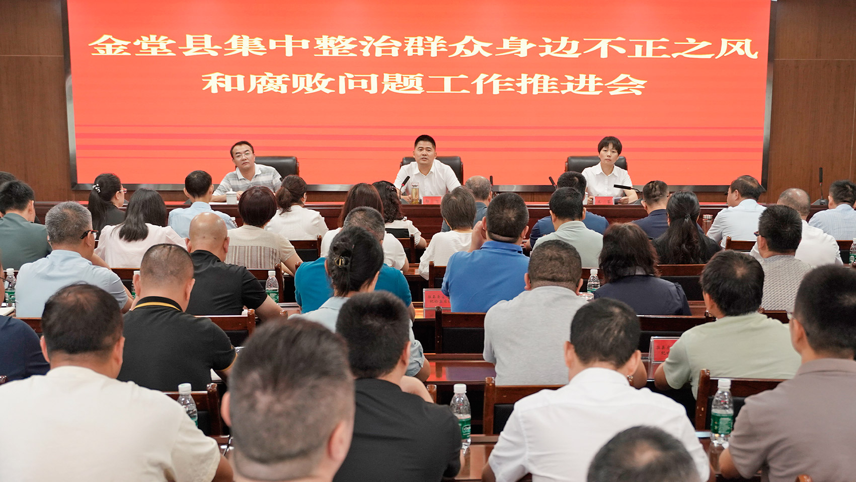 晋兆东同志(左一)生前参加金堂县集中整治群众身边不正之风和腐败问题工作推进会。
